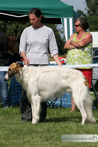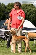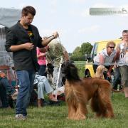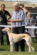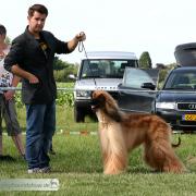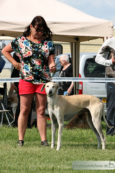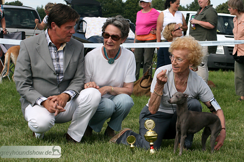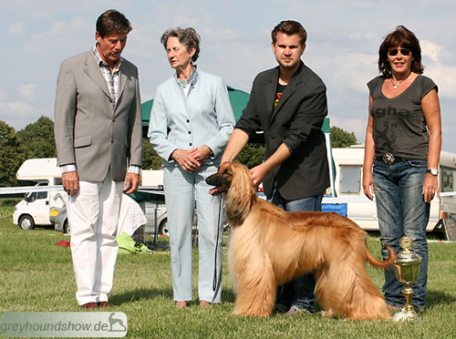 Gut 140 Windhunde waren zur Sommer-Ausstellung auf dem Issumer Segelflugplatz gemeldet. Bei bestem Wetter wurde mit Zindehsjah's Edoardo ein Afghanischer Windhund Best in Show-Sieger, hier zu sehen mit den Richtern Wim Wiersma (NL), Roel van Veen-Keur (NL) und Marion Marpe.