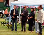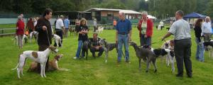 Es war schon ein tolles Bild, als die 40 Greyhounds (aus Deutschland, den Niederlanden und Belgien) unter den Klängen irischer Volksmusik in den geschmückten Ehrenring einmarschierten. Der Vorsitzenden der Landesgruppe Rheinland, Martin Haas, eröffnete die Zuchtschau und stellte das internationale Richtergremium vor, dabei wurde allen im Ring Anwesenden ein Glas Sekt zur Begrüßung gereicht. Dann begann das mit Spannung erwartete Richten, auch diesmal war die Typen-Vielfalt unserer Rasse zu erkennen.